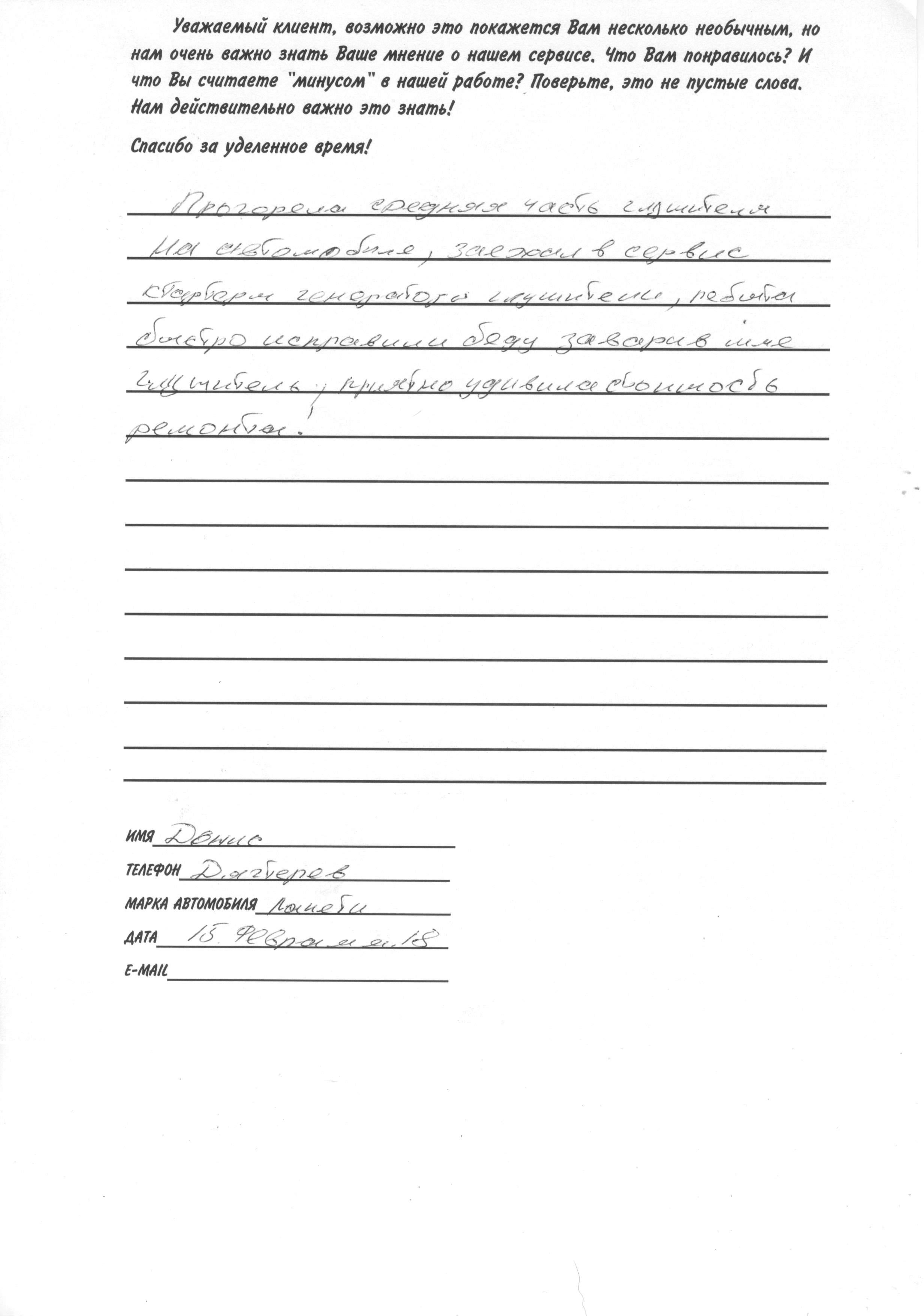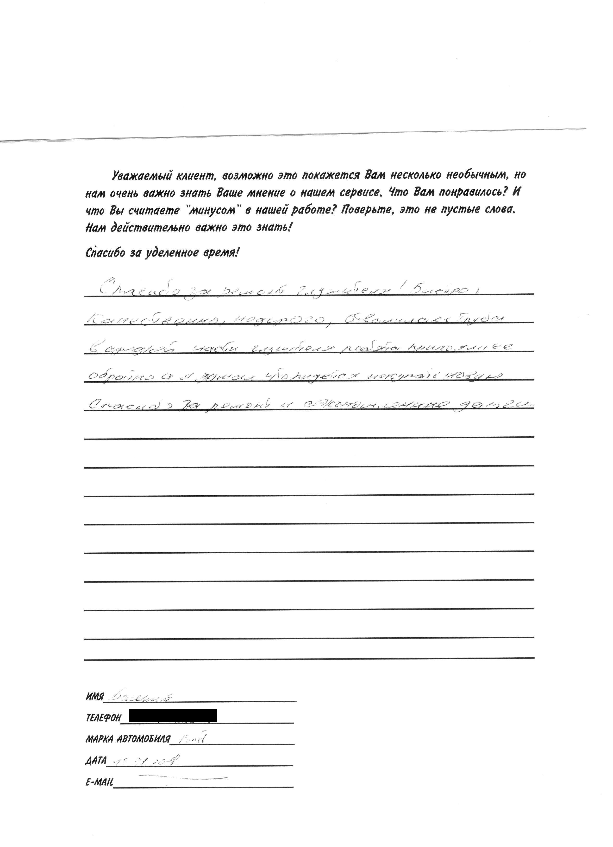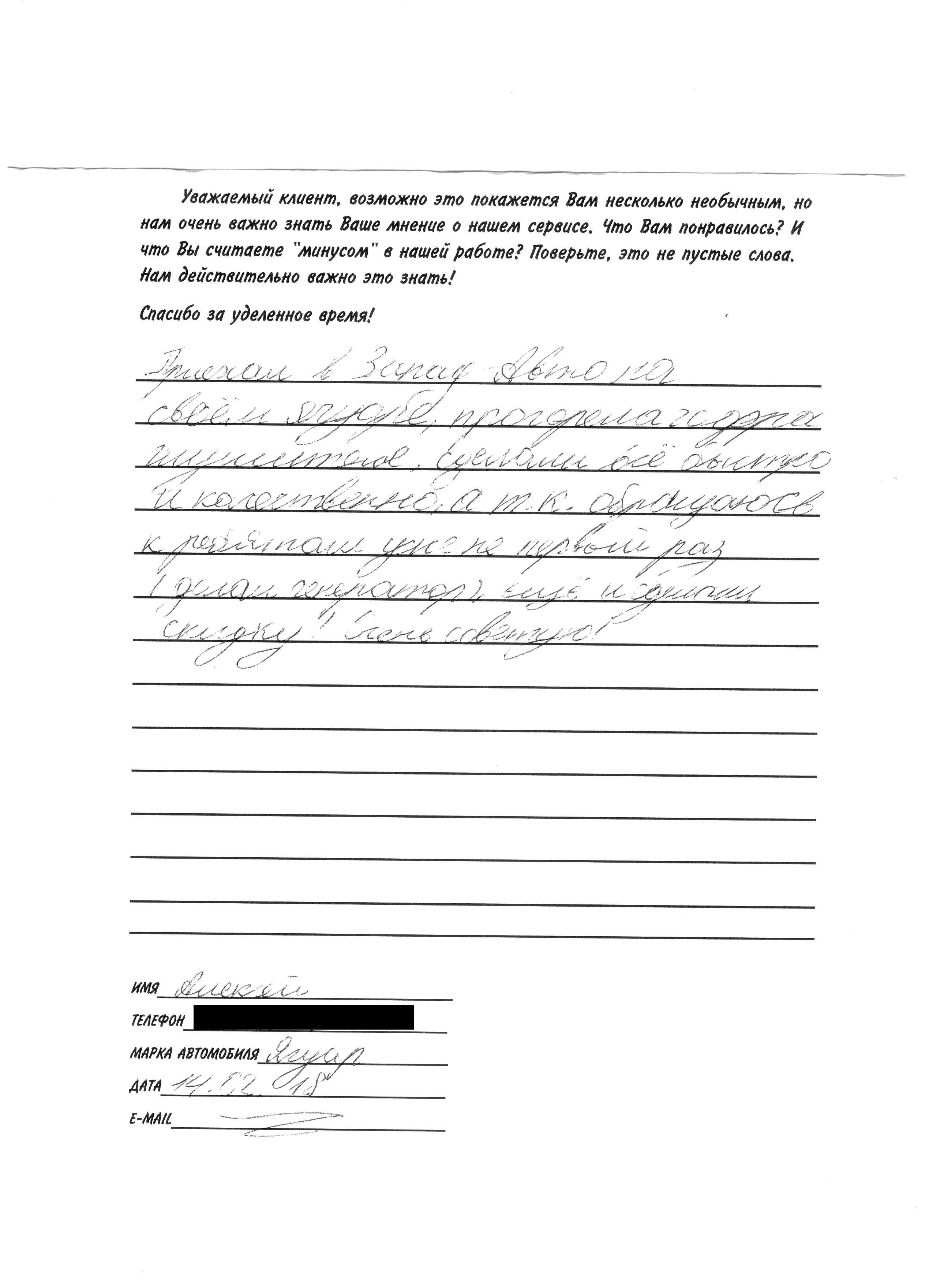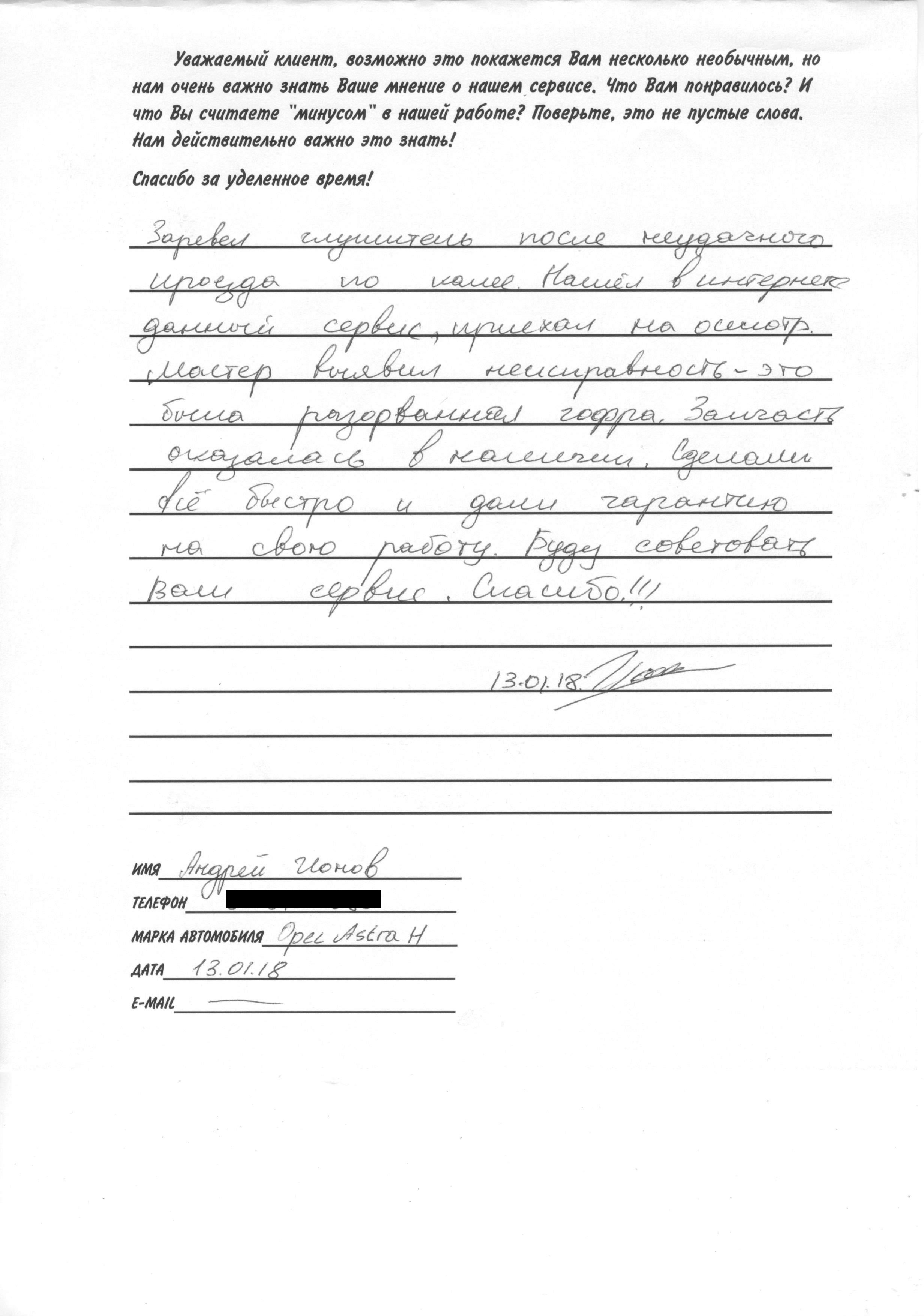 Заревел глушитель после неудачного проезда по калее. Нашел в интернете данный автосервис, приехал на осмотр. Мастер выявил неисправность - это была разорванная гофра. Запчасть оказалась в наличии. Сделали всё быстро и дали гарантию на свою работу. Буду советовать ваш сервис. Спасибо!!!